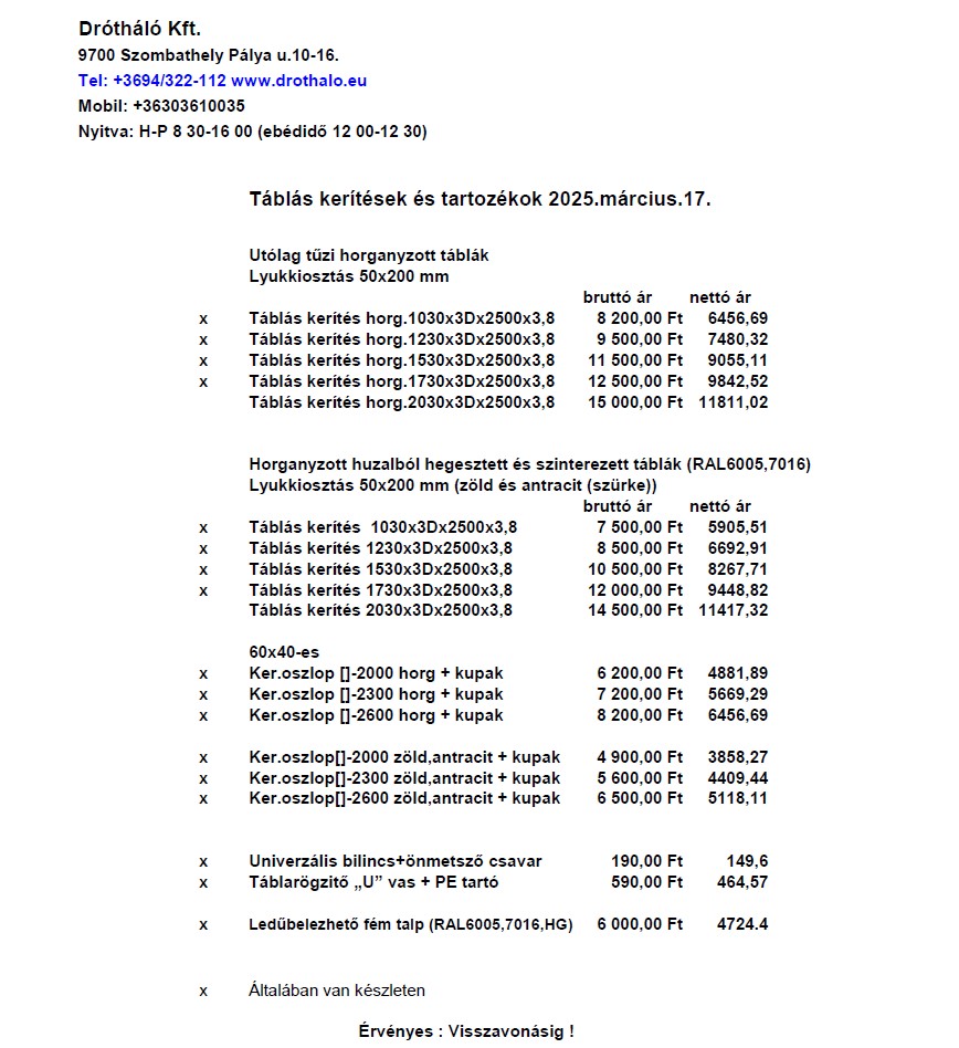 - Kerítésfonatok, ponthegesztett hálók árjegyzéke